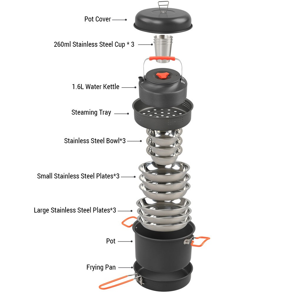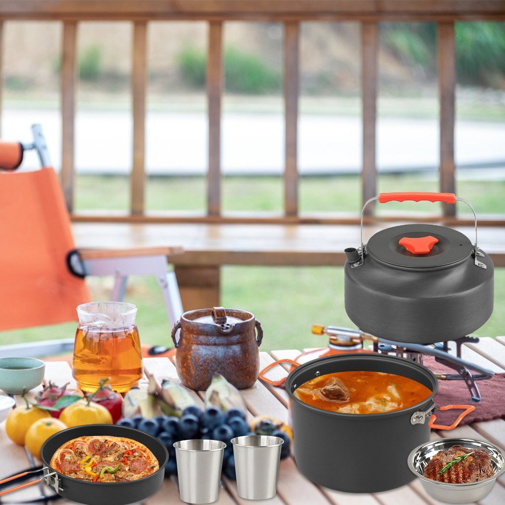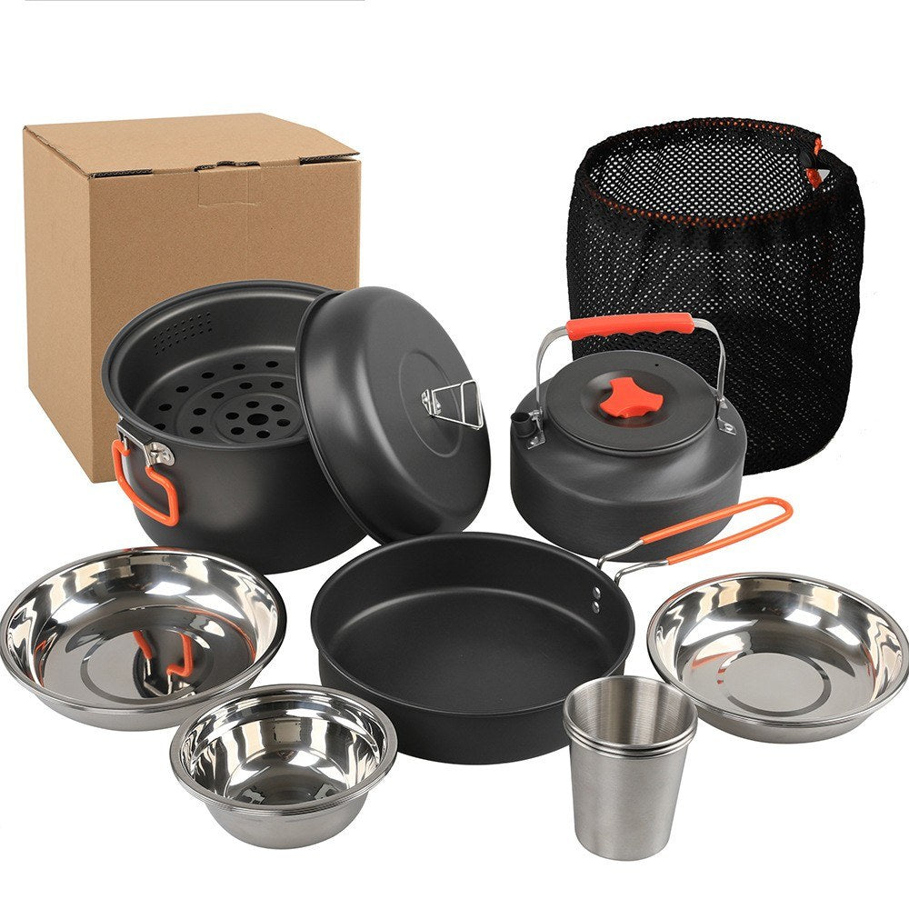 Aluminum Camping Cookware Mess Kit: Pot, Pan, Steaming Tray, Bowl, Cup, Kettle & Cover