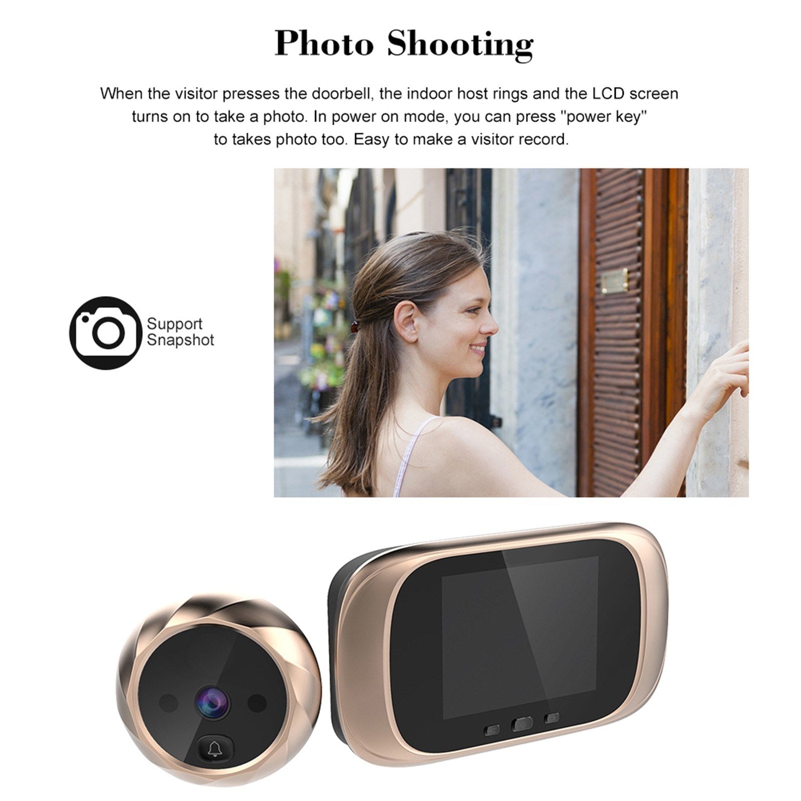 - Photo Shooting: Automatically takes a photo when the doorbell is pressed. You can also manually capture photos by pressing the "power key" in power-on mode. This makes visitor recording effortless.