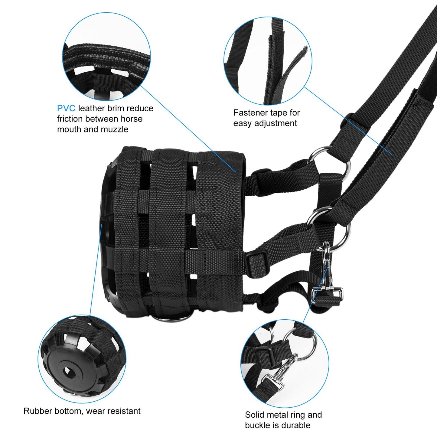 Our product features a fully adjustable, secure fit beneath your horse's chin, utilizing a convenient fastener tape strap. This design is particularly beneficial for horses that are on a diet or prone to founder and colic. Experience ease of use and enhanced safety for your equine companion today.