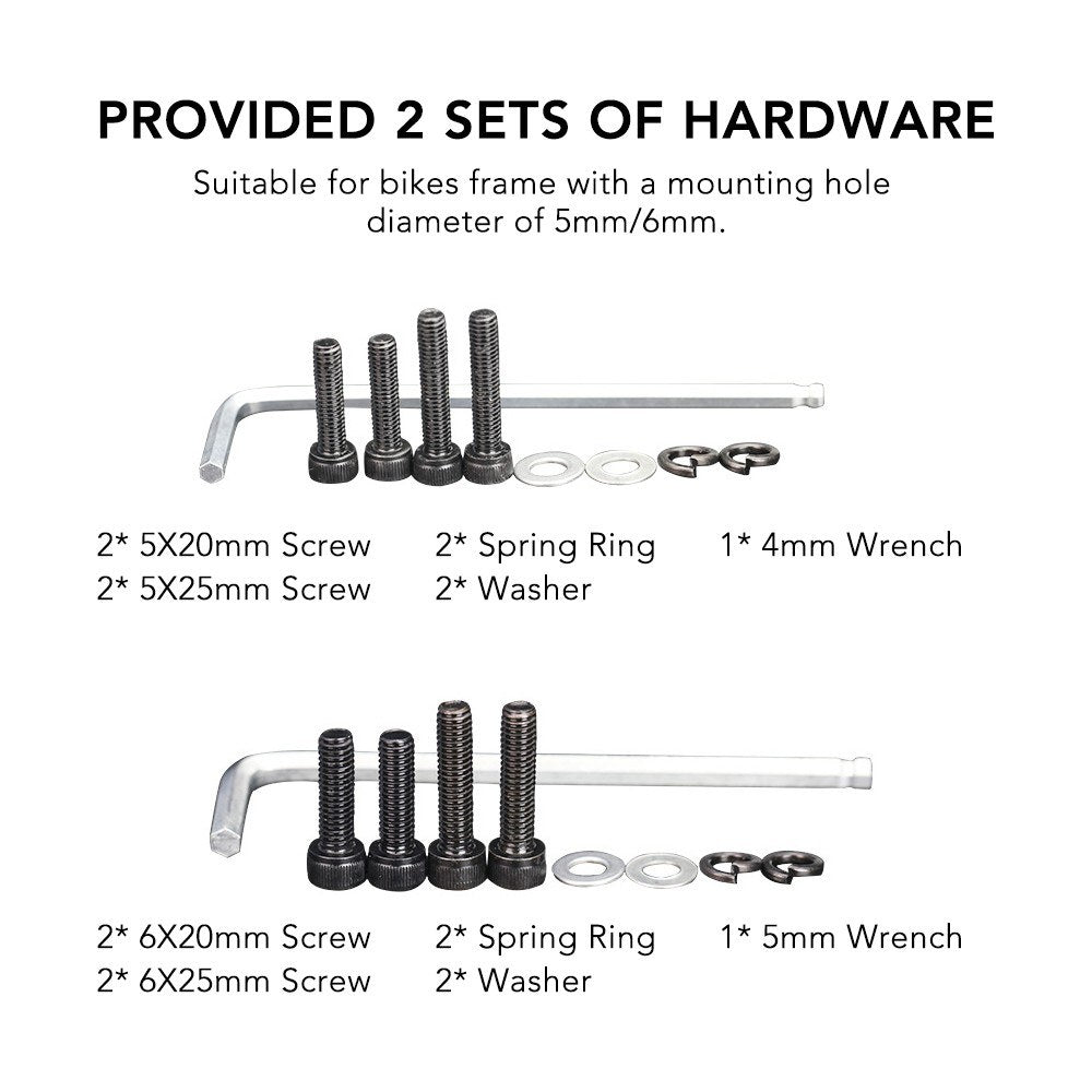 - Includes 2 sets of hardware, compatible with bike frames that have a mounting hole diameter of 5mm or 6mm.