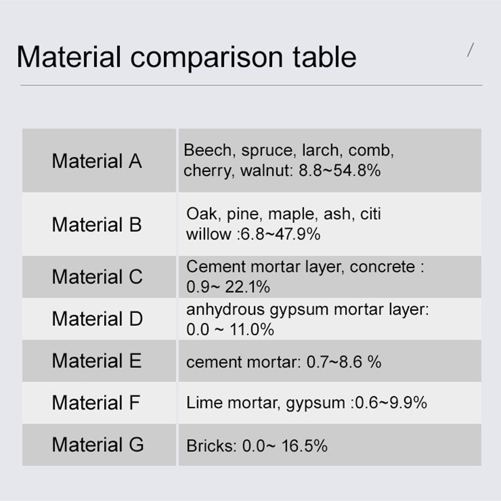 - 7 Material Types: Measures moisture content across 7 different wood and material types, assisting in determining drying requirements.