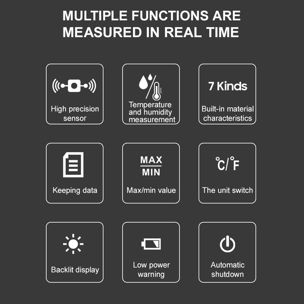 - Material Humidity Range: 0.0~57.0%, ±2.0%