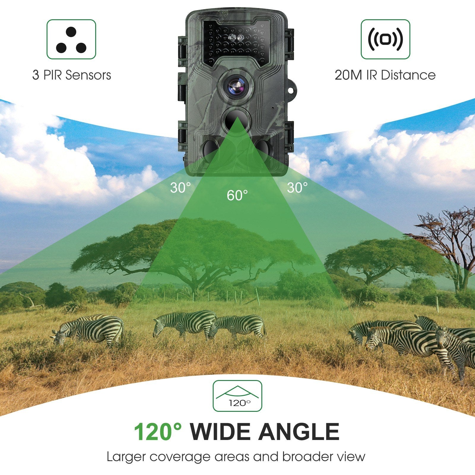 This trail camera features a highly sensitive PIR sensor and a 120° wide lens angle to detect and record every breathtaking motion at an impressively fast speed of 0.3-0.6 seconds. Engineered to be weather-resistant and durable, it's perfect for outdoor scouting, wildlife observation, and security for home and office.
