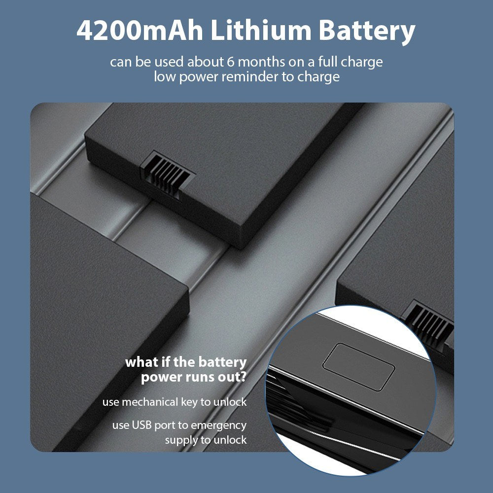 The lock comes with an emergency power supply for times of power outages. It is equipped with a built-in rechargeable lithium battery that has a low power reminder. A single full charge powers the lock for up to three months, ensuring reliable performance.