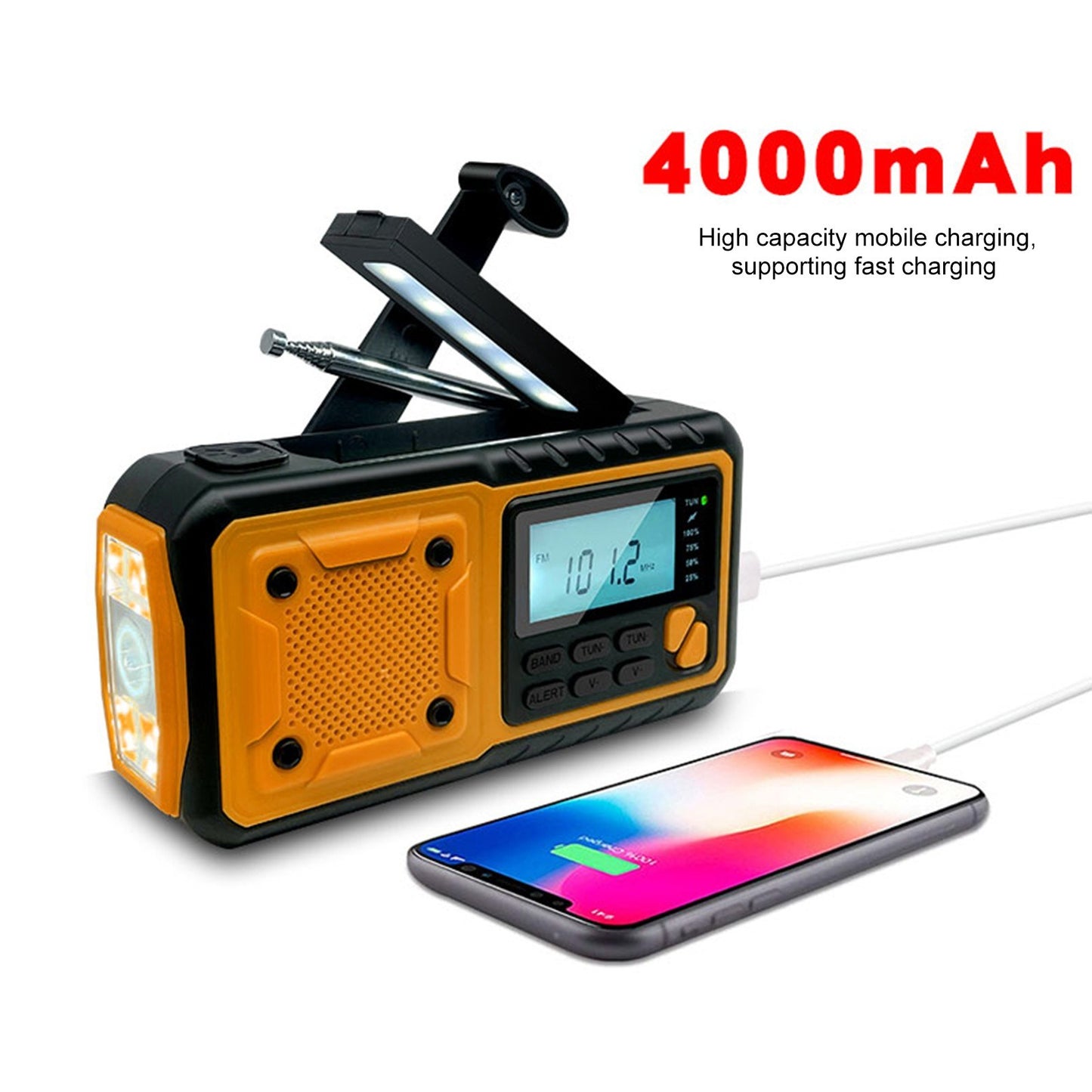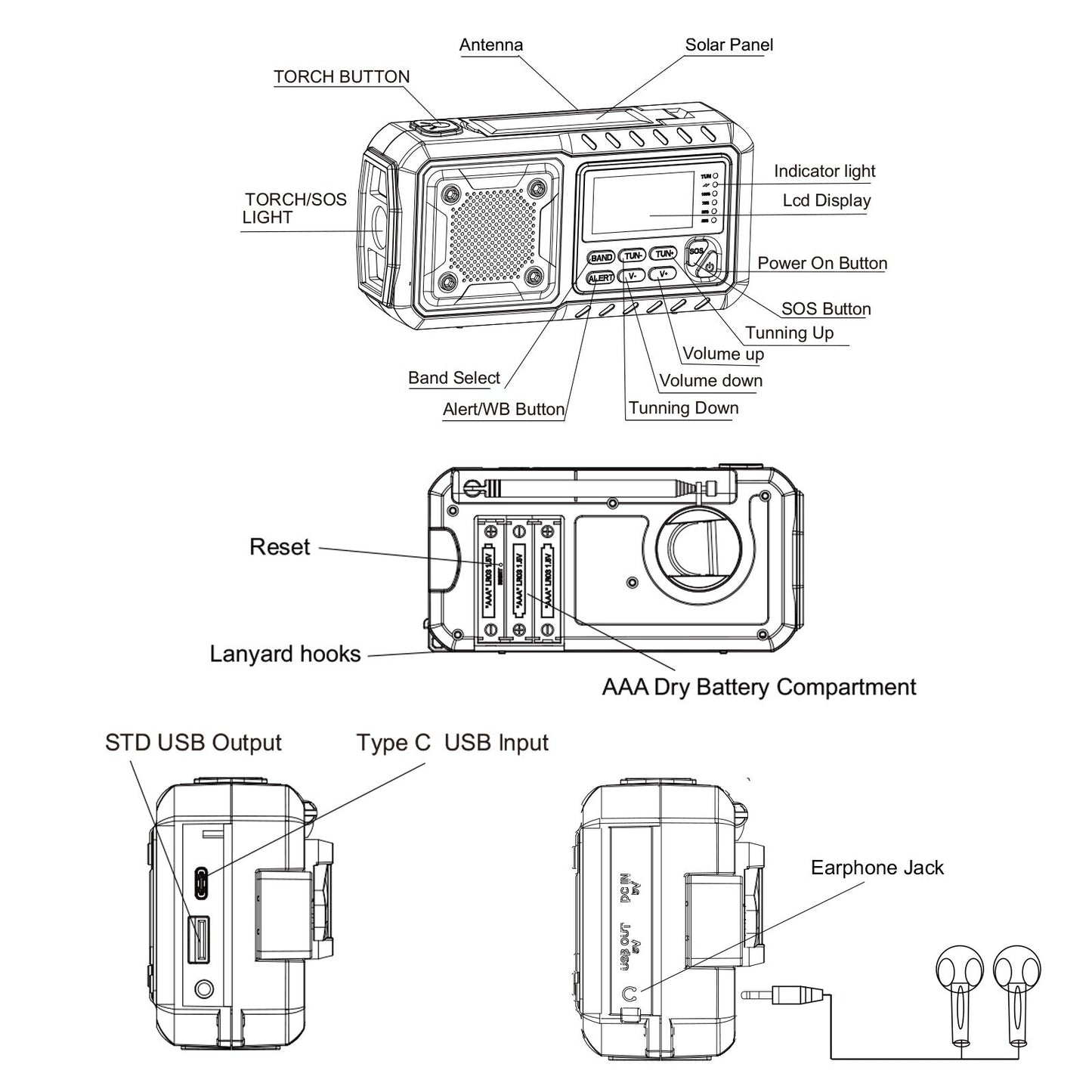- Four power supply modes: 3 AAA batteries (not included), hand-crank, solar charging, and Type-C input.