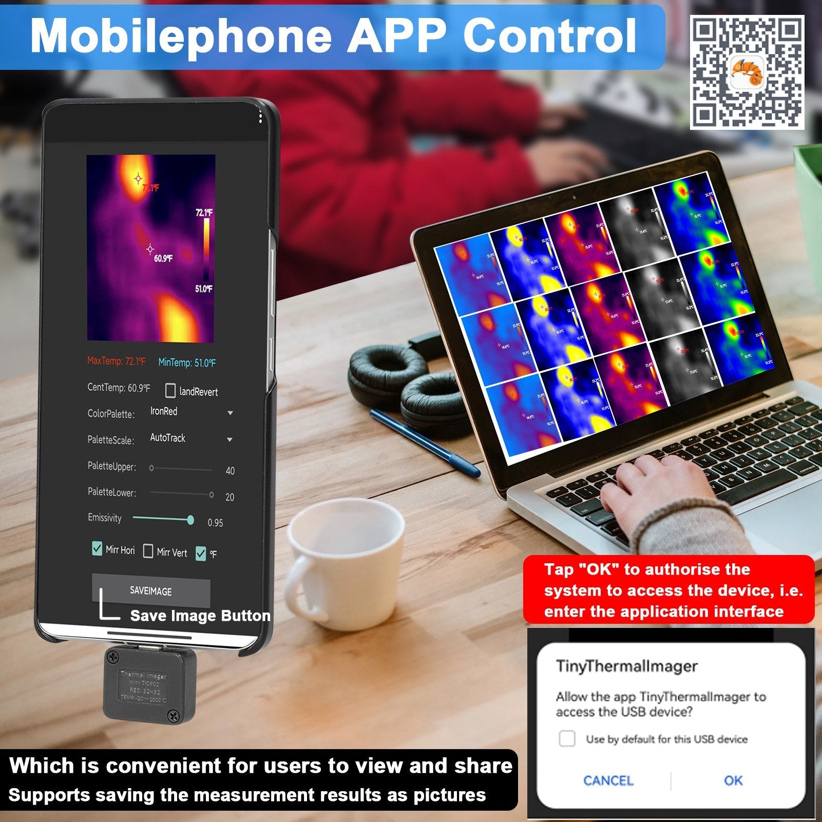 - Mobile App Control: Compatible with the TinyThermal app, it supports Android and Hongmeng systems, available in English and Simplified Chinese. Users can save measurements as images for easy viewing and sharing.