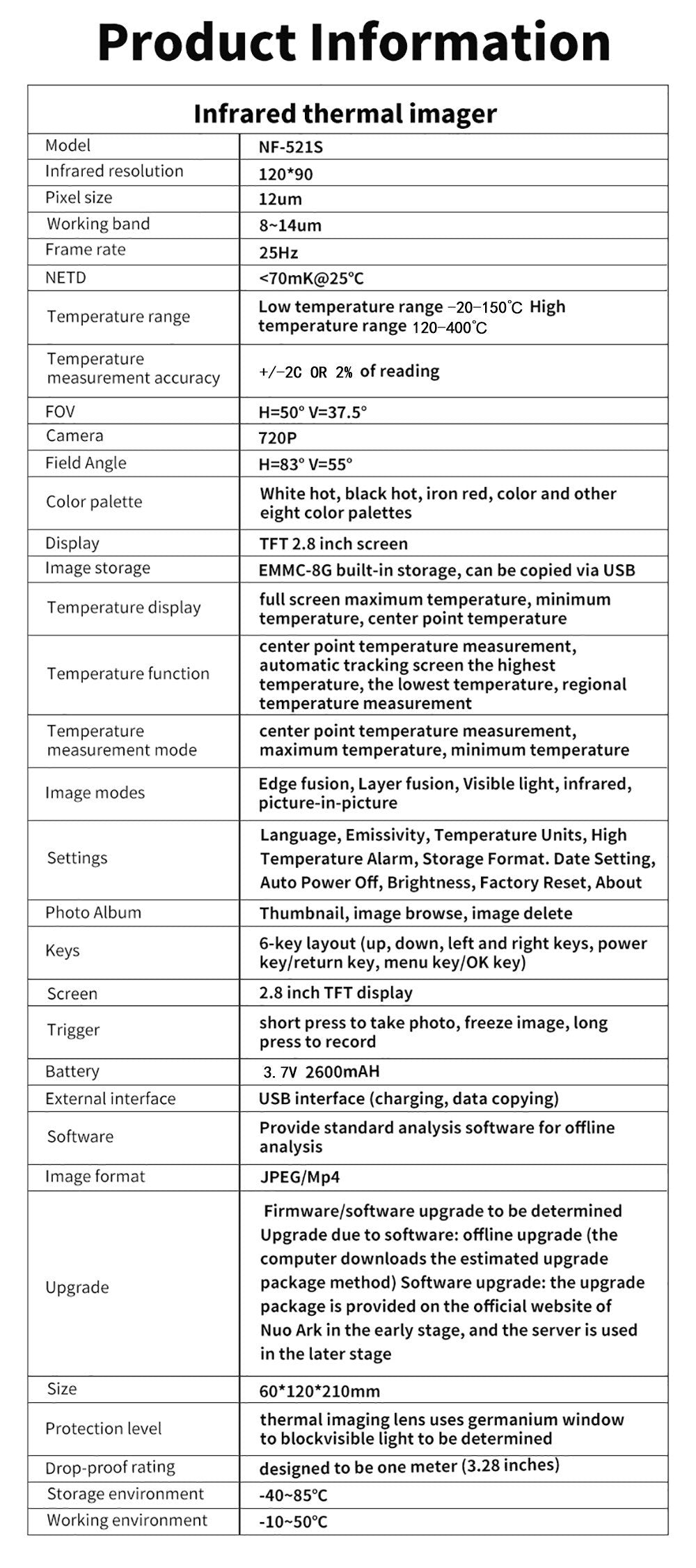 | Temperature Measurement Accuracy | ±2℃ or 2% of reading |