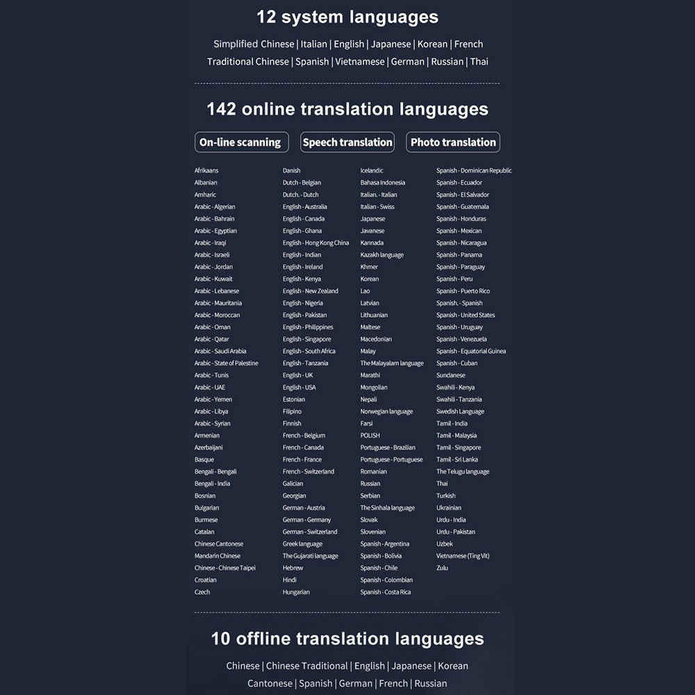 - Multilingual Translation Capabilities: The Translation Pen Scanner is designed to meet diverse language translation needs with 142 options for online scanning, voice translation, and photo translation. It also supports pinyin scanning for accurate translations. Additionally, it offers 10 offline scanning functions, enabling text translation without an internet connection.