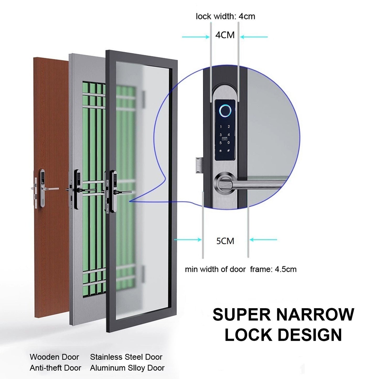 Versatile Compatibility: With standard compatibility, the TY WiFi Smart Door Lock fits a wide range of doors. It comes equipped with a bag of screws and a 3585 lock body, allowing straightforward installation on doors with thicknesses ranging from 40mm to 120mm. The narrow panel design, measuring just 40mm in width, makes it suitable for various types of doors, including aluminum alloy glass doors, KFC doors, and shielded doors.