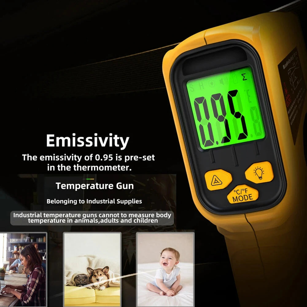 - High-Precision Infrared Thermometer: Built with durable, drop-resistant ABS material for a comfortable grip and versatile usage. The large LCD backlit display ensures clarity in various lighting conditions. It is equipped with a high-sensitivity sensor, measuring temperatures from -50℃ to 530℃ with remarkable accuracy (±2%/±2℃) and a swift response time of 0.5 seconds. Additional features include data hold, scan status indication, and battery level alerts to enhance user experience.