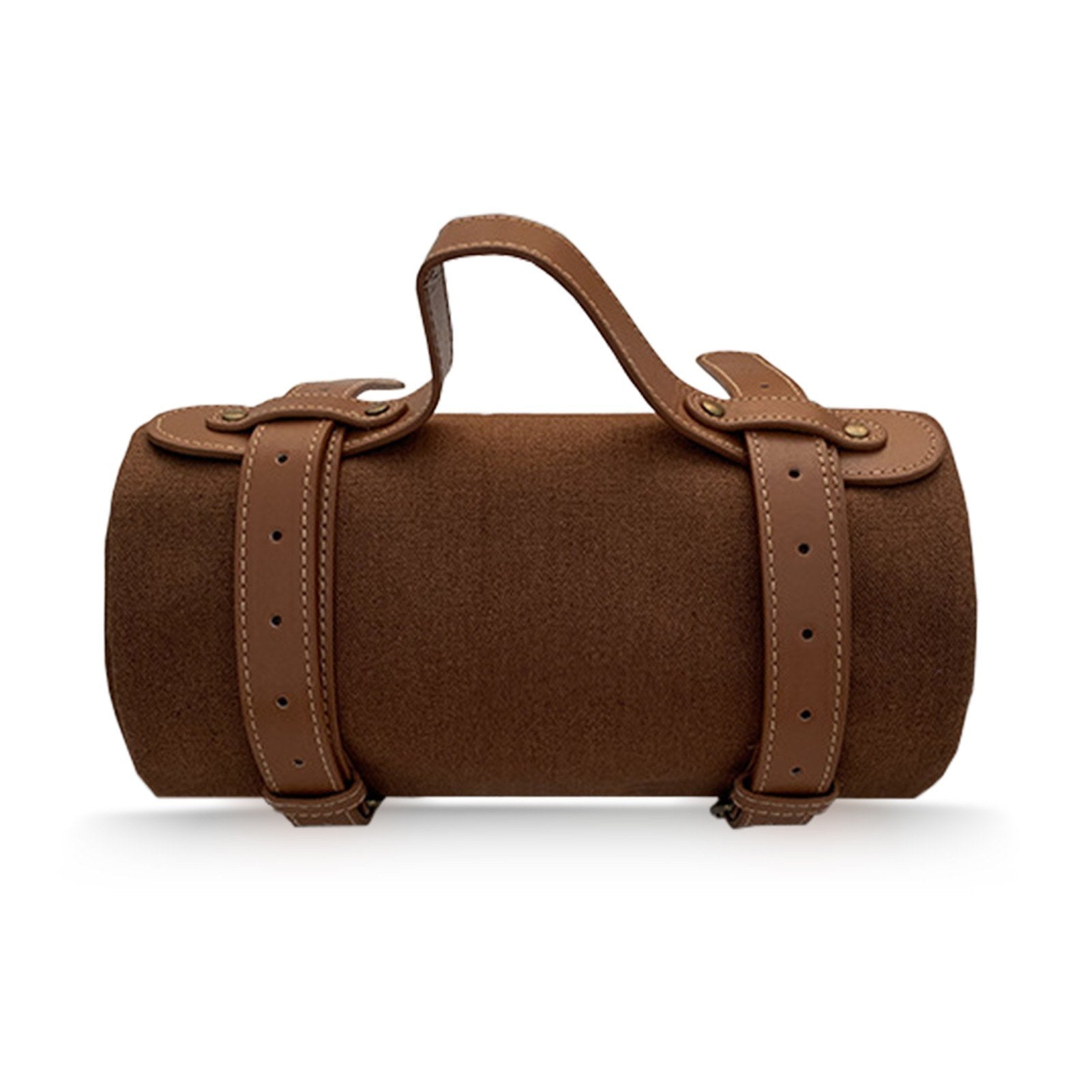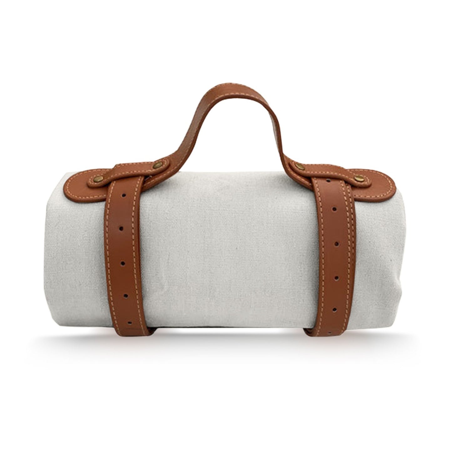 - Quickly rolls and folds into a compact size, secured with leather fastener straps.